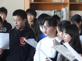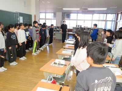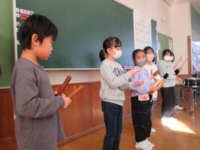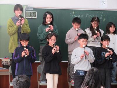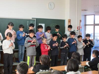 12月19日(金)4校時、3年生と4年生が合同音楽を行いました。それぞれの音楽の学習で学んだ曲をリコーダーで演奏し、互いに聴き合うこと、互いの良さや感じたことなどを伝え合うことが目的です。まず4年生が、「オーラリー」という曲を演奏しました。3年生からは、「高い音程と低い音程の重なりがきれいだった。」「みんな揃っていて素晴らしかった。」などの感想が出されました。お返しに3年生が、「パフ」を演奏。4年生からは、「リズム感が良かった。」などの感想が出されました。学びの成果を誰かに伝えること、そして価値づけられ評価されること、このような交流を今後も積極的に行っていきたいと思います。