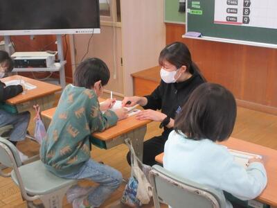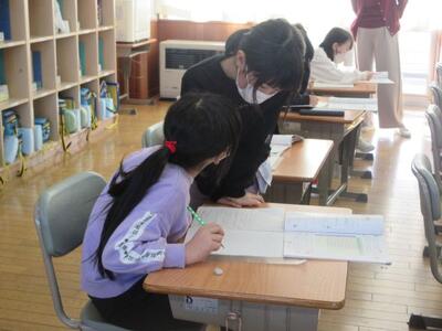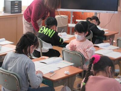 12月3日(水)3校時、2年担任の池田教諭が算数の授業を提案しました。これまで学習したかけ算を用い、変則的な並びをした物の個数を効率よく求めることがめあてです。学習プリントの問題に対し子供たち一人一人が書き込みをし、まとまりを作りながらかけ算で個数を求めていきます。途中、「じっくり一人で」「ヒントが欲しい」「仲間と伝え合う」など自分の進度や希望に応じて、必要感を持って仲間と交流していきます。発展問題にも意欲的に挑戦した2年生。学ぶ意欲が大いに高まり、子供たち一人一人が達成感と満足感を味わうことができました。