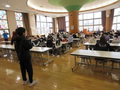 12月11日(木)5校時、職業講話第2弾として、6年生が本校出身である3名の谷地高生の皆さんから、谷地高の学校生活の魅力や今意識すべきことなどのお話を聴きました。6年生のためにギリギリまで検討し作成されたプレゼン資料には、谷地高の1日の流れや教科、部活動、魅力などが写真やイラスト入りで丁寧にまとめられていました。お話を聴いた後、6年生からは制服や校則のこと、複数回あるテストのこと、部活動のことなどたくさんの質問が出され、いずれの質問にも丁寧に答えていただきました。6年生には、谷地高生から最後にお話があった「今意識すべきこと」を今後意識し、充実した学校生活を送って欲しいと思います。谷地高生の皆さん、本当にありがとうございました。