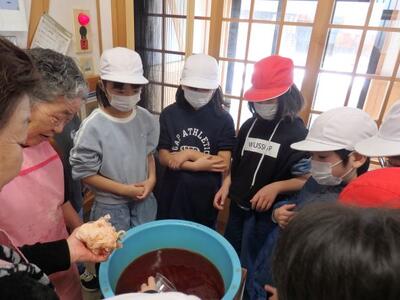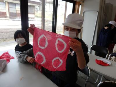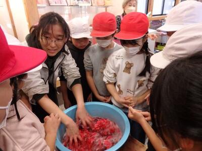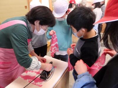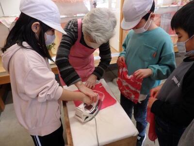 12月10日(水)、3年生が町内の紅染め工房「くれない」を会場に、紅花染め体験を行いました。10月末の南小祭にて、紅花から染物ができることまで調べ発表していた子供たち。知識で終わらず、今回は貴重な体験の機会です。複数名の地域講師から染め方の手順等を丁寧に教えていただいた後、早速チャレンジ。手が朱色になることにも驚きの表情を見せながら、最後まで自分の作品を仕上げました。アイロンをかけて完成した作品は、まさに世界でたった1枚の宝物。色鮮やかなハンカチに、子供たちの笑顔が輝きました。