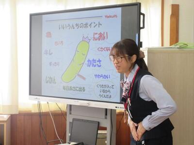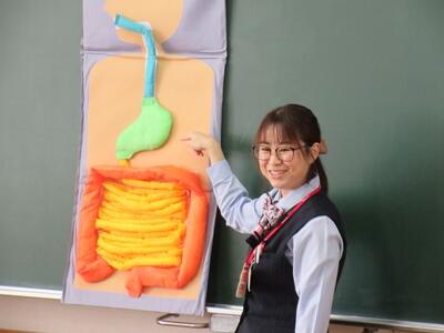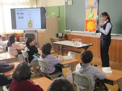 12月12日(金)3校時、ヤクルト社員の方を講師に、3年生が栄養指導を受けました。口から食べたものが、食道・胃・小腸・大腸を通る中でどう変化するのか等を、プレゼン資料や模型を使いながら丁寧に教えていただきました。各消化器官の役割を知っている子どもが複数おり、講師が感心する一場面も・・・。健全な成長や丈夫な体づくりのために、子供たちにはしっかりとした食事を摂って欲しいと思います。ぜひ、各ご家庭で、今日の学習内容を話題にしていただきたく思います。