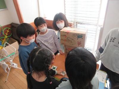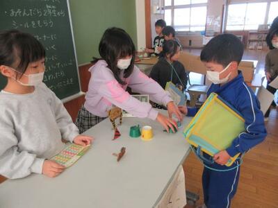 12月16日(火)3校時、2年生教室隣の空き教室から楽しそうな笑い声が・・・。覗いてみると、教室いっぱいに「手作りおもちゃコーナー」がセッティングされ、2年生が笑顔で1年生に説明しています。遊びかたやルールなど、丁寧にわかるまで説明を続けています。いよいよ1年生がチャレンジ。最初は戸惑いながら、遊び方に慣れてくるとどんどん笑顔で夢中になって遊びを楽しみます。1年生は、2年生の説明を最後まで聴き、ルールを守って遊びます。2年生は、1年生を楽しませようと説明や手助けを惜しみません。本当に素晴らしい交流です。