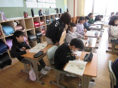 1月15日(木)、3学期の学習を本格的にスタート。2年生は、音楽で「あのね、のねずみは」を学習中。「3番まである歌詞以外に、他の動物なら何と鳴くのかな。」という指導者の問いに子供たちが反応し、他の動物の鳴き声で自ら歌詞を作成。みんな笑顔で歌っていました。4年生は、算数で評価テストをタブレットでチャレンジ。タブレットの扱いや問題の進め方などについてICT支援員と教務主任からもサポートを受けながら、問題を解き進んでいました。