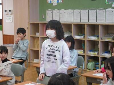 1月16日(金)1校時、2年生は算数で、繰り上がりを学習中。3999に1を加えると答えはどうなるのか、位取り表が書かれたワークシートに「1」「10」「100」「1000」の数シートを並べながら考えました。4000という答えに至った子どもたちは、担任や仲間に対して、そうなった道筋を順序立てて説明します。「繰り上がり」という算数用語を用いて「説明する力」が問われます。また、5年生は国語で「言葉のスケッチ」を学習中。担任から提示された写真に描かれた内容を相手に正確に伝えるために、どんな言葉で説明するかを考えます。子供たちの言語力が磨かれます。
