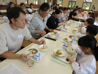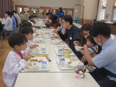 「いただきます。」を合図に、普段の学校生活ではできない保護者との食事や会話は、お互いかけがえのない時間でした。いつもより給食が美味しく感じたのかもしれません。おかわりをする子供も多くいました。