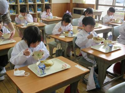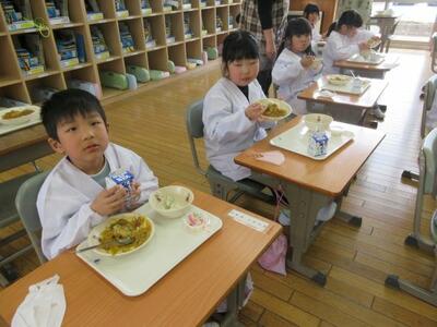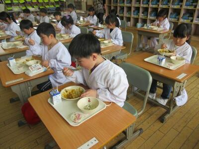 4月16日(水)登校時に、1年生の女の子が校長に「今日から給食、とっても楽しみ。」と笑顔で話してくれました。担任と学習指導補助員の指導の下、安全に盛り付け等を行い、みんな揃って「いただきます。」待っている間は、動画で一口で食べる適切な量を指導するという準備体制。メニューは、カレーライス、アスパラサラダ、牛乳、おめでとうゼリーです。「カレーライス、甘くておいしい。」「アスパラ苦手だから、最初に食べたんだよ。」など、思い思いの感想を伝えてくれました。「食べたもので体はできている。」を合言葉に、給食指導・食育指導を充実させていきます。