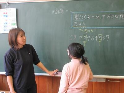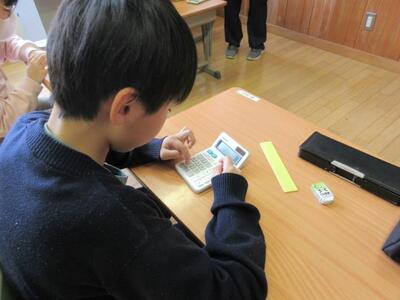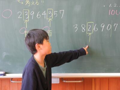 4月17日(木)2校時、教室の配置が変わり、2名の在籍となった特別支援わかば学級の授業を参観しました。算数で、電卓を使って大きな数を表し、その仕組みを理解することがめあてでした。担任から提示された数を正確に電卓で表します。位取りに気を付けて、正しく読みます。子供たちは、抵抗なく正確に読んでいて感心!! 次に難易度が上がり、各位の数字は、何が何個あることを意味しているのかを考えます。一人一人が考えた後、黒板の前に出て担任と仲間に説明し、互いに正解かどうかを確認します。これもパーフェクト。担任と仲間に褒められて笑顔が輝きます。