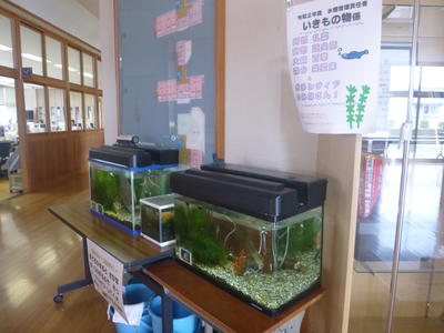 学校を入るとすぐ、ミニミニ水族館です。生き物係がお世話をしています。