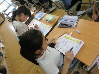 運動会の興奮がまだ冷めやらぬ6月3日(火)。学校は、日常の生活に戻りました。5校時、4年生は落ち着いて国語の漢字学習。丁寧な文字で漢字を書き、仲間と確認し合います。正しく書けていたら、仲間に温かな花丸をプレゼント。6年生教室からは、賑やかな笑い声が・・・。レクリエーション係が考えた椅子取りゲームで大盛り上がり。仲間と体を密着させ、椅子を取り合います。