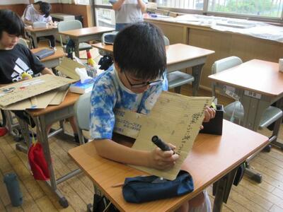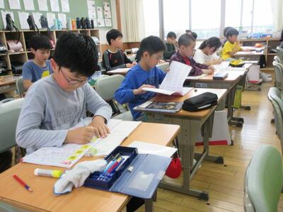 6月11日(水)3校時、1・6年生は合同体育。スポーツテストの反復横跳びのしかたを6年生が1年生に優しく教えていました。練習の後、いよいよ本番。動きに慣れた1年生が最後までがんばって横跳びをやり遂げました。6年生からは、温かい拍手が・・・。5年生は、図工で看板を製作中。5年教室のPRや廊下歩行の注意喚起を促す看板など、一人一人の思いや願いが作品に込められていきます。校舎内への看板設置が楽しみです。ふたば学級に入ると、子供たちの目線はタブレットの画面にくぎ付け。eライブラリの理科の問題に悪戦苦闘。楽しく学びを深めていきます。