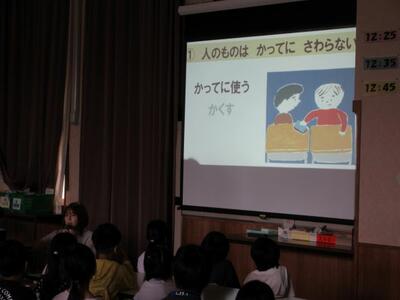 6月4日(水)朝の時間、全校朝会として生徒指導主任による講話を行いました。運動会が終わり目標を見失いがちな時期に、改めて仲間とどう接していけばいいか、みんなが気持ちよく生活するために大切なことは何か、などについて話をしました。身の回りの整理整頓や自分の物と他者の物の区別、そして最も大切なこととして「仲間を傷つけたり悲しませたりする言動を行わないこと」を確認しました。