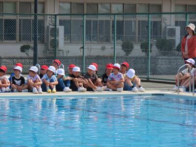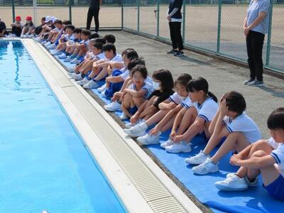 6月16日(月)2校時、晴天の下、先陣を切って3・4年生が水泳学習を行いました。入念な準備運動の後、担任から水泳学習中の安全指導がありました。その後、プールに移動して、水慣れの運動。プール内を円を描くように動き、流れを作ります。最後に、水中に置かれたリングや棒などの学習材を潜って取ります。あちらこちらから歓声や水しぶきが上がり、楽しい水泳学習が終わりました。今後も安心・安全な中、楽しい水泳学習を続けていきたいと思います。