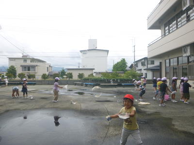 1年生が南部っ子広場でシャボン玉のお勉強。歓声が上がります。