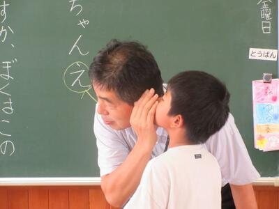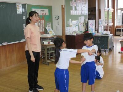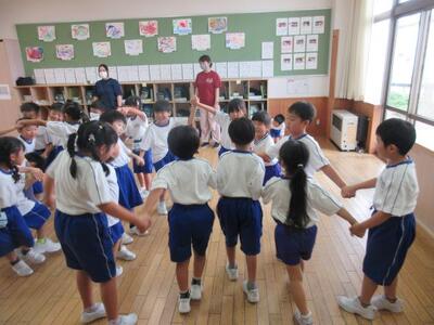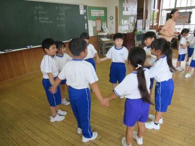 8月27日(水)、2学期三日目を迎えました。3校時、1年生は体育で「ごっこ遊び」を楽しみました。初めは、ペアやグループで輪くぐり遊び。仲良く、上手に体を動かします。その後、担任の指示で、様々な動物や音、風景などを体全体で表現します。子供たちは恥ずかしがらずに、思い思いの動きを楽しみ、笑顔が弾けます。中には、本物そっくりの表情や動きをする子どもも・・・。生き生きとした「ごっこ遊び」に感心しました。