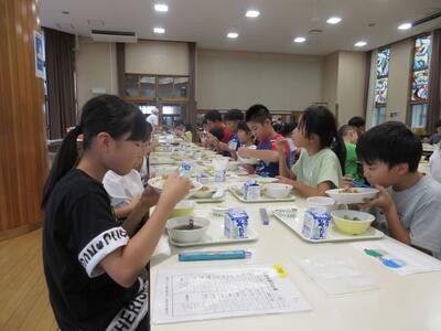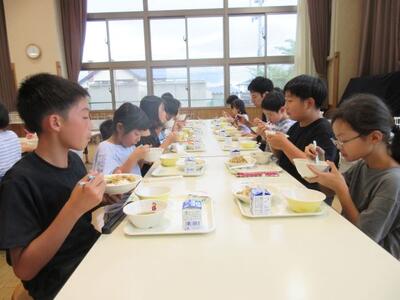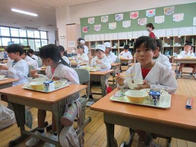 8月27日(水)、今日から2学期の給食がスタートし、1年生は教室で、2年以上は食堂で縦割り班給食です。1学期の経験が生かされ、落ち着いて安心・安全な盛り付けに感心します。当番の「いただきます。」の挨拶に合わせ、みんなで感謝しながらいただきました。メニューは、焼き肉丼・ブロッコリーサラダ・もずくのスープ・ぶどうゼリー。みんなしっかりと食べ切りました。明日からの給食も、とても楽しみです。
