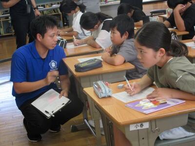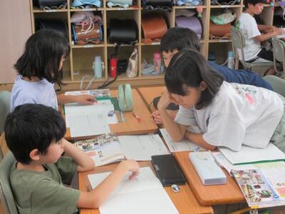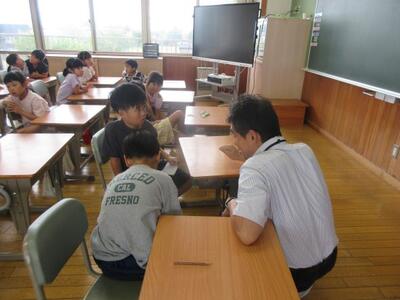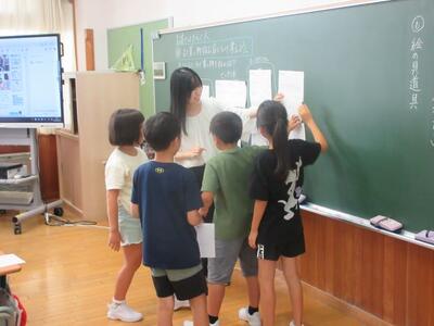 8月29日(金)、2年生は国語の学習場面を参観しました。初任研後補充で勤務いただいている真田教諭による指導です。黒板に書いた文章をよく読み、間違いを探します。一見すると気付かないような読点の必要性を考えさせます。まずは、一人一人にじっくりと考えさせ、気づいた子供にはそっと耳打ちで答えさせます。その間も一人一人は他にないのか必死に考えていました。3年生は、社会で「お店で働く人」の学習です。自分や家族と一緒に行ったことがあるお店をリストアップ。その後、グループ内で交流し、全体でさらに広げます。カードに書いた内容を読むと、お店の雰囲気や客数、障がいのある人への配慮など、子供たちの様々な気づきに感心しました。