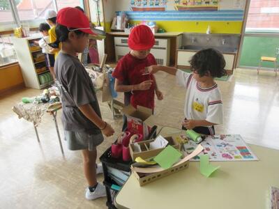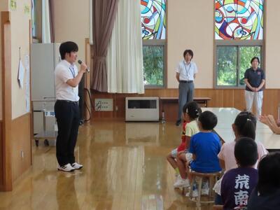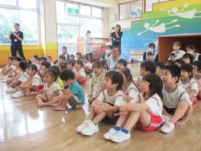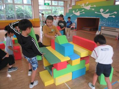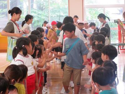 9月5日(金)3校時、4年生がひかり幼稚園に出向き、年長児を中心に交流してきました。一番のねらいは、来年度の1年生を5年生としてどう迎え、どうかかわっていくかを考えることです。最初は全体で年長児とゲームで遊び、その後、グループに分かれて年長児の活動を支えたり一緒に遊んだりします。4年生は一生懸命年長児との対話を行い、楽しい時間になるよう頑張ります。対話の時には、姿勢を低くし、年長児の目線を心がけます。素晴らしい配慮ですね。最後は、歌を3曲披露し、別れを惜しみながら帰校しました。「また、ひかり幼稚園に来たい!!」そんな声がたくさん聞かれ、心温まる素敵な交流でした。