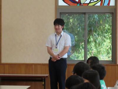 9月1日(月)、今日から9月22日(月)までの毎週月・水・金曜日、東北文教大学1年生の秋場悠聖さんが教育ボランティアとしてお手伝いしてくださいます。本校を卒業した先輩で、将来小学校教員を目指しています。臨時朝会の中で自己紹介をしていただきましたが、とても落ち着いており、子供たちが真剣に耳を傾けていました。2校時には、早速1年生の学習支援を行い、子ども目線で優しく支援いただきました。