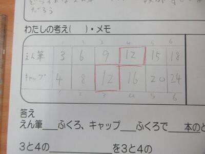 9月3日(水)3校時、5年担任の秋場助教諭が算数の授業を提案しました。内容は公倍数で、一袋3本入りの鉛筆と一袋4本入りのキャップを等しい組み合わせになるよう購入する時、それぞれ何袋購入すればよいかを考える時間です。子供たちは、図を描いて、表に書き表して、そして倍数の考え方を用い式で・・・と複数の方法でアプローチ。仲間と積極的に交流しながら、それぞれの考え方の良さを全体で共有しました。