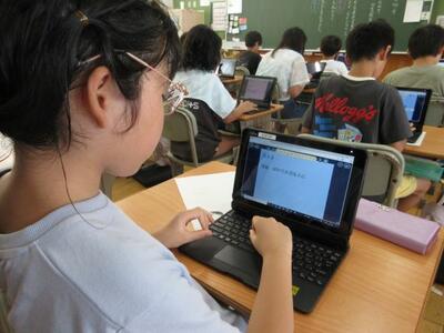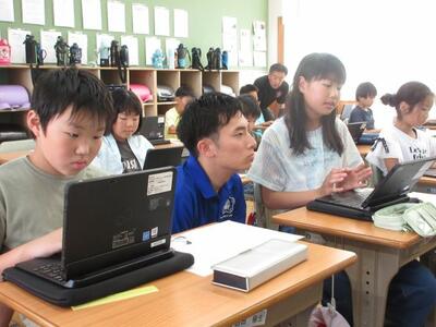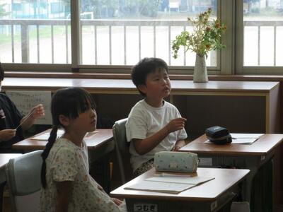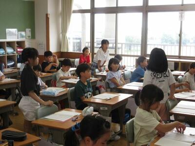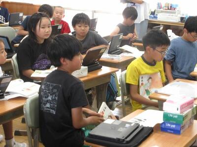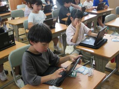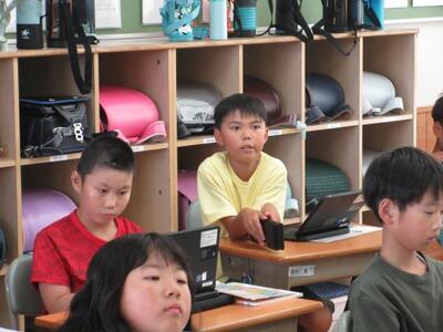 7月8日(火)3校時、1年生は図工で、初めて絵の具を使った学習に取り組みました。道具の名前や学習しやすい並べ方など基本的な内容を確認してから、準備を進めます。「ぼくの筆、どうして硬いのかな。」子供たちは、道具一つ一つに興味関心を示し、学習への期待を膨らませていました。2年生は、算数でタブレットを活用したドリル学習に夢中でした。自分で問題を選び解いていきます。「やったあ、メダルをゲットした!!」そんな喜びの声があちらこちらから起こっていました。