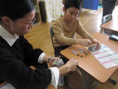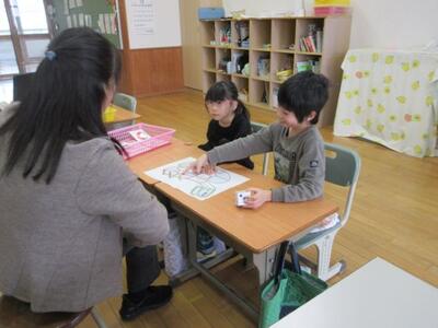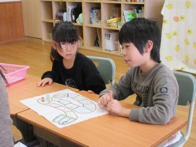 11月6日(木)に、ふたば1組、2組の授業研究会を行いました。1組では、国語で「お話すごろく」を楽しむ学習でした。順番を決め、さいころの目が出たマスに書いている質問に答えていくというものです。担任も加わりながら、質問に笑顔で正しく答えようとがんばりました。また、2組では、算数で「繰り上がりのあるかけ算」を学習しました。前時で扱った「23×3」をもとに「23×4」でも同じように計算できるかを考えます。敢えて担任から間違った計算方法を提示し、思考を揺さぶります。お金の模型で正答を確かめた後、筆算で計算する時のポイントを学んでいきます。最後まで集中し学習する姿に成長を感じました。
