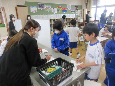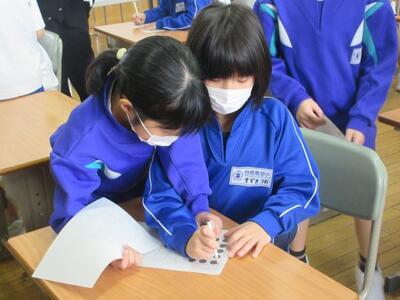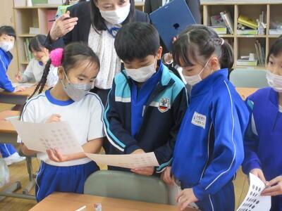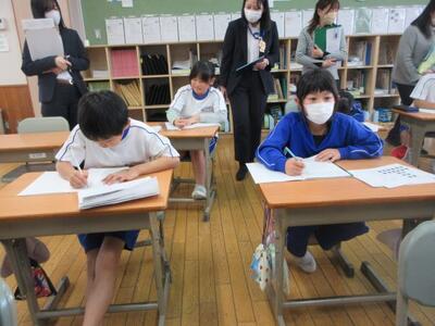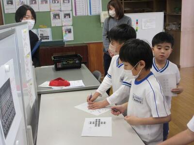 12月3日(水)3校時、2年担任の池田教諭が算数の授業を提案しました。これまで学習したかけ算を用い、変則的な並びをした物の個数を効率よく求めることがめあてです。学習プリントの問題に対し子供たち一人一人が書き込みをし、まとまりを作りながらかけ算で個数を求めていきます。途中、「じっくり一人で」「ヒントが欲しい」「仲間と伝え合う」など自分の進度や希望に応じて、必要感を持って仲間と交流していきます。発展問題にも意欲的に挑戦した2年生。学ぶ意欲が大いに高まり、子供たち一人一人が達成感と満足感を味わうことができました。