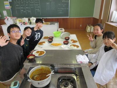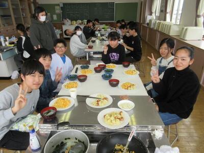 1月30日(金)3・4校時、6年生が家庭科の学習で調理実習を行いました。内容は、肉や野菜等を使って一食分を調理するというものです。各班後に、カレーライスやチャーハン、カルボナーラ、野菜炒めなどたくさんの種類の料理に挑戦。はじめは、包丁の使い方など恐る恐る作業を進めていた子供たち。けれども作業が進むにつれ、仲間同士で声がけ合い助け合いながら、次々と料理を完成させていきます。どの班も時間内に予定していた料理をすべて完成!! 職員室にもお裾分けをいただきました。とっても美味しかったです!! 6年生の皆さん、ごちそうさまでした。