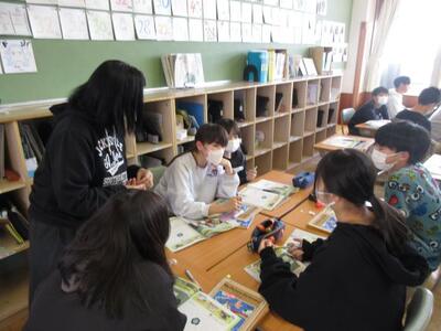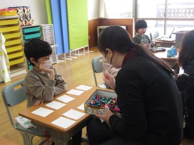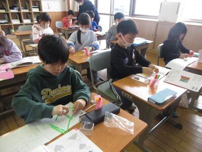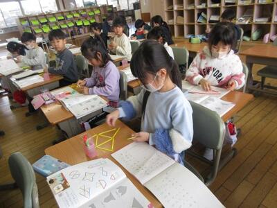 3月5日(木)2校時の授業風景。1年生は、子供たちの机の上に数え棒が並んでいました。何をしているのかをよく見てみると、数え棒を並べて魚やヨットなどいろいろな形を作る学習でした。数え棒をどうつなぎ合わせるか、何本使うかを考えながら作業していました。6年生は、AET並びに英語専科教員と外国語の学習中。「Where do you want to go ?」の問いに、英語で答える場面。一人一人緊張しながらもがんばって英会話を進めていました。ふたば1組では、算数を学習中。飴の模型を用紙に置きながら、かけ算の意味理解と計算に挑戦。タブレットでeライブラリを活用し、ぐんぐん問題を解いて学びを進めていく姿も・・・。年度末まで、当該学年の学びに力を入れていきます。