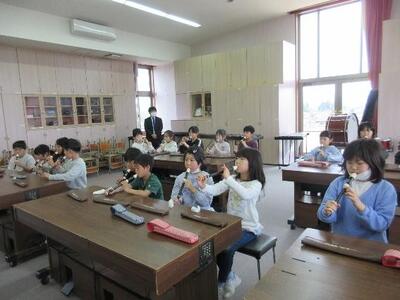初めてのリコーダー 投稿: 谷地南部小学校 (11:24) 4月27日、渋谷啓子先生を講師にむかえ、3年生のリコーダー講習会が行われました。上手になるためのポイントととして、やさしい息の使い方、タンギング、穴の押さえ方を学びました。名探偵コナンのテーマ曲、Mrs.GREEN APPLEの「ライラック」などの模範演奏では、みんなノリノリな様子。練習も一生懸命。音楽の授業が益々楽しみになりますね。