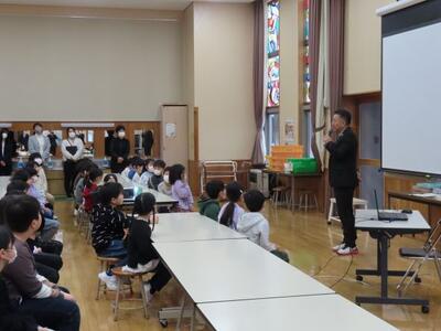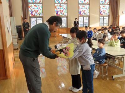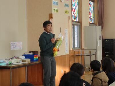 4月より、新採教員が研修や出張等で不在時に、替わって授業をしてくださっていた真田非常勤講師が、今日で最終日を迎えました。2年生の図工と国語の授業、給食指導、そして魅力的な本の紹介など、本校の教職員と子供たちのためにたくさんのお力添えをいただきました。お別れ会の中で、2年代表児童からお礼の言葉と花束をプレゼント。お返しに「好きなことをたくさん見つけると、楽しく生活できると思います。」と、素敵なメッセージをいただきました。明日からも多岐にわたるお仕事を控えていらっしゃるとのこと。ご活躍を期待しております。真田先生、本当にありがとうございました。
